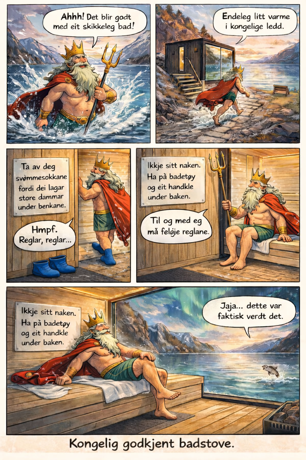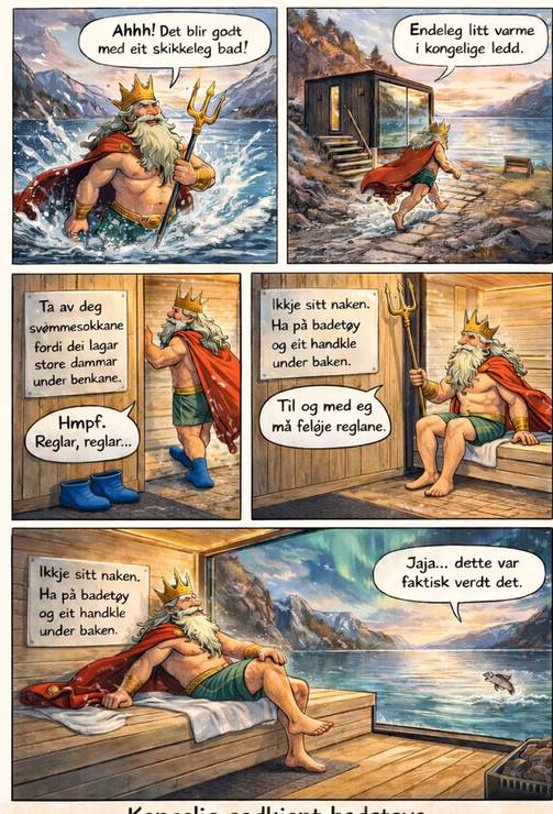 Vi ønskjer ei så rein og triveleg badestaue som mogeleg så pass på å skylle føtene etter eit bad i sjøen. Bruk stampen som heng på veggen. Du sit på eige handkle.